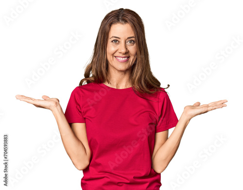 Middle-aged woman portrait in studio setting makes scale with arms, feels happy and confident.