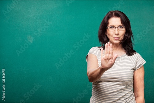 Middle-aged woman showing stop sign