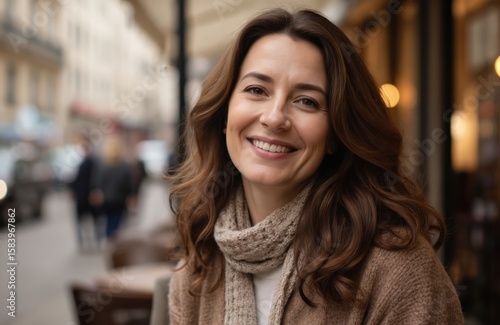 Middle-aged woman wears gray scarf, white shirt on gray sidewalk with buildings and trees. Face partially obscured by hair, gray background with cafe architecture style. Romantic atmosphere.