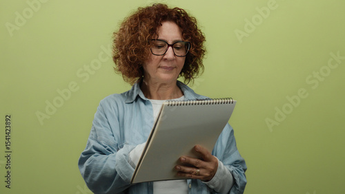 Middle-aged woman writing in notebook against isolated yellow background, wearing glasses and casual denim shirt.