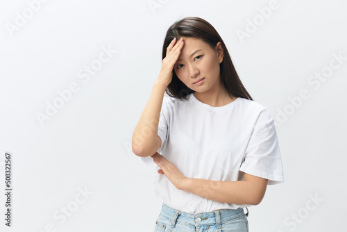 Migraine. Side view of unhappy suffering from headache tanned beautiful young Asian woman touching forehead posing isolated on white background. Injuries Poor health Illness concept. Cool offer Banner