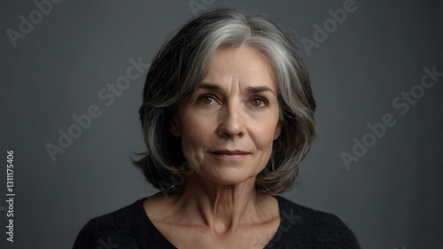 Minimalism. Studio portrait of a naturally aging elegant gray-haired elderly woman in an interior and clothes of calm tones. The concept of the elderly.