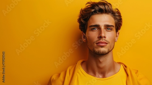 minimalist vivid advertisment background with handsome suprhero and copy space