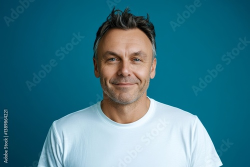 minimalistic portrait of adult European softly smiling man is 50 years old wearing white T-shirt on blue color background