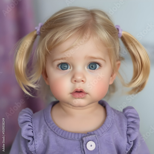 Mirada tierna, coletas rubias y un traje morado perfecto.
