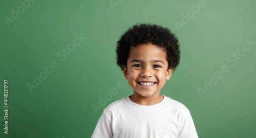 mixed race kid boy green background wearing plain white tshirt smiling happy portrait
