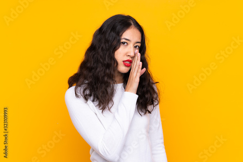 Mixed race woman over isolated yellow background whispering something