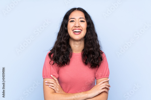 Mixed race woman wearing a sweater over isolated blue background laughing