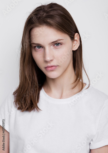 Model test portrait with young beautiful fashion model posing on grey background. Wearing white t-shirt. Classic portrait.