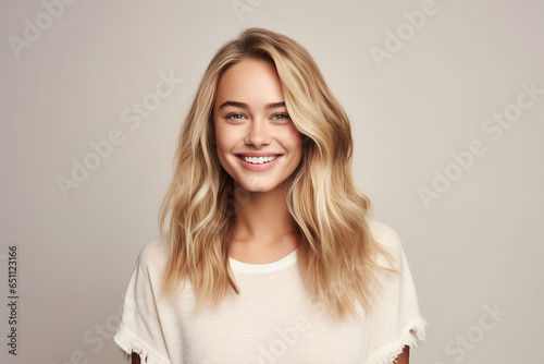 Modern Illustration generative AI collage charming blonde woman smiling white teeth isolated pastel beige color wall background