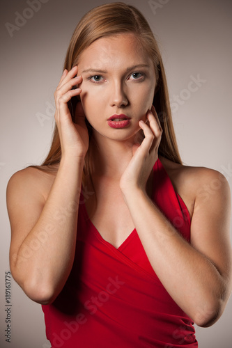 Moody studio portrait of a beautiful young brunette woman with long hair