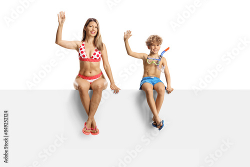 Mother in bikini waving and son in a swimming suit sitting on a blank panel
