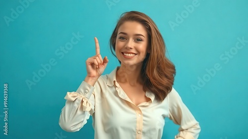 Mujer modelo posando señalando con el dedo índice hacia arriba, fondo verde claro rostro expresivo.