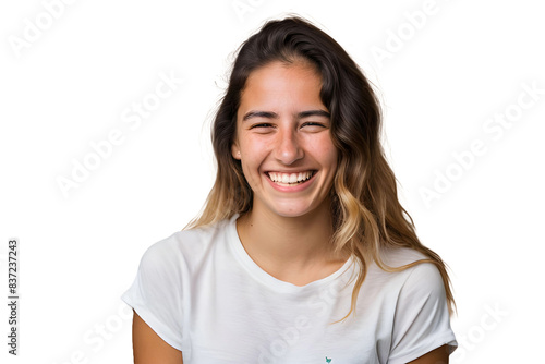 Mulher jovem de camisa branca sorrindo com fundo transparente png