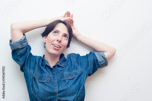 natural beautiful woman in blue jeans smiling and looking up with her hands upon her head.