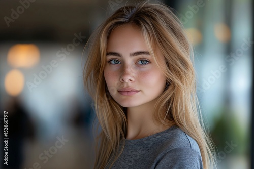 Natural Beauty Portrait of a Young Woman with Blonde Hair. Soft Focus Close-Up in Urban Daylight
