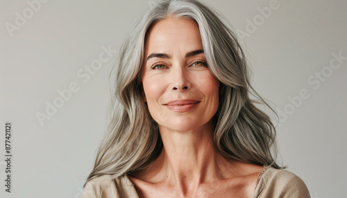 Natural beauty portrait of serene and elegant mature caucasian woman with grey hair. Female slightly smiling. Light background studio shot. Natural female beauty and fascinating aging concept.