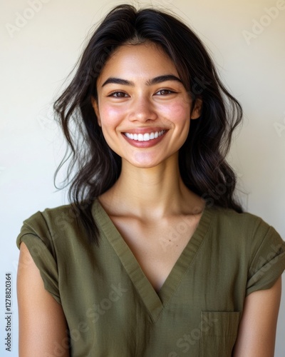 Natural Beauty Portrait Radiant Asian Female in Olive Linen Top - Modern Skincare Diversity for Inclusive Marketing and Lifestyle Branding
