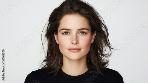 Natural Portrait of a Beautiful Woman with Medium Length Hair and Soft Features on a Light Background