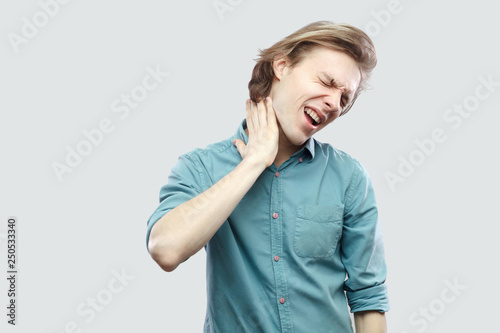 Neck pain. Portrait of sick handsome long haired blonde young man in blue casual shirt standing holding his painful neck because feeling bad. indoor studio shot, isolated on light grey background.