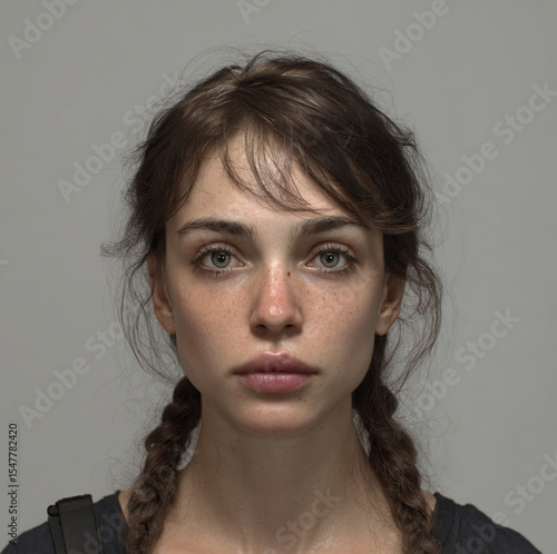 neutral portrait of a young woman with a serene expression and twin braids.