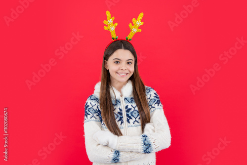 new year holiday. happy teen girl in new year sweater and deer antlers in studio.