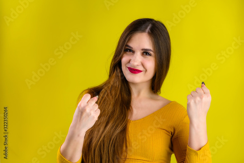 nice brunette girl with long hair with a smile in a yellow jacket rejoices on a yellow background, smiles and shows positive emotions
