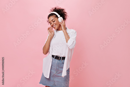 Nice woman in good mood listening to music with headphones on pink background. Portrait of happy curly girl in denim skirt and white shirt enjoying song on isolated backdrop