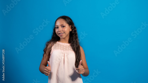 Niña con blusa rosa con fondo azul usando, señalando con sus dedos.