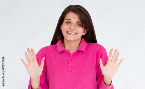No, everything fine really. Intense worried and nervous cute female in pink sweatshirt, stopping backwards, holding palms raised near chest in sorry gesture
