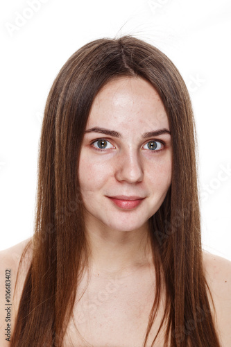 NO MAKEUP Natural Clean Face of Young Brunette Girl Without No makeup. Studio Portrait White Isolated