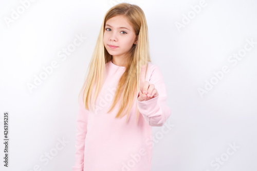 No sign gesture. Closeup portrait unhappy beautiful caucasian little girl wearing pink hoodie over white background raising fore finger up saying no. Negative emotions facial expressions, feelings.