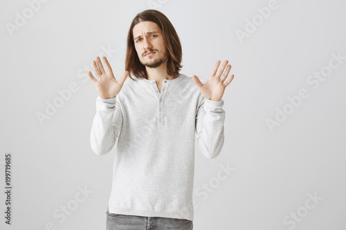 No way, I reject this offer. Indoor shot of displeased indifferent handsome guy raising palms in enough or stop gesture, being uninterested in suggestion, expressing dislike and declining it