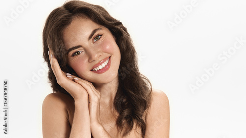 Non-surgical enhancement and beauty fillers concept. Portrait of smiling young woman with glowing skin, looks happy and pleased with result after dermatological procedure in salon, white background