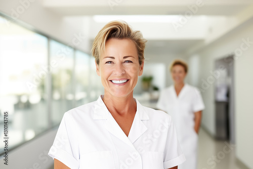 Nurses day. Smiling nurse in her 40s in a modern healthcare facility with a colleague in the background. Hospital workers.