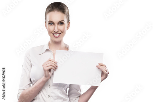 office girl in white blouse holds papers in hands and smiles isolated on white