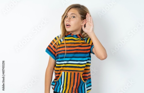Oh my God! Funny astonished beautiful caucasian teen girl wearing striped T-shirt over white wall opening mouth widely looking aside, with hand near ear trying to listen to gossips.
