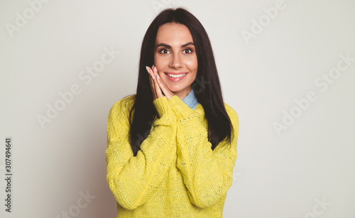 Oh, please! Close-up photo of a beautiful girl in a yellow knitted sweater, who is looking in the camera with a cheerful facial expression and holding her palms near her cheek.