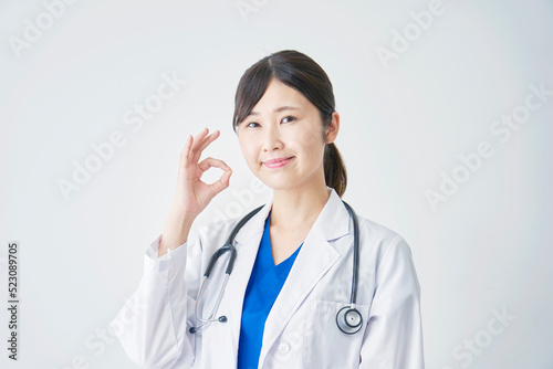 OKサインする女性医師 白バック