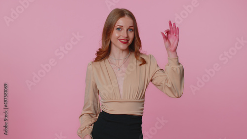 OK. Happy positive businesswoman girl in beige blouse looking approvingly at camera showing ok gesture, like sign positive something good. Young adult woman isolated alone on pink studio background
