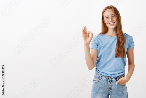 Ok no problem. Portrait of friendly and joyful good-looking redhead girlfriend with freckles holding hand in pocket having casual talk assuring work be done in time showing okay or excellent gesture