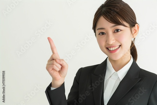 指をさす日本人の女性ビジネスマンウーマンのポートレート写真(白背景・会社員・スーツ・若手・OL・新入社員・窓口・案内)