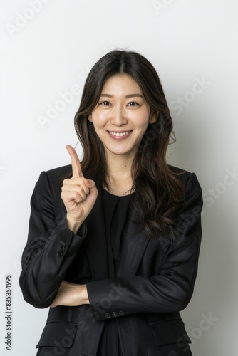 指をさす日本人の女性ビジネスマンウーマンのポートレート写真(白背景・会社員・スーツ・若手・OL・新入社員・窓口・案内)