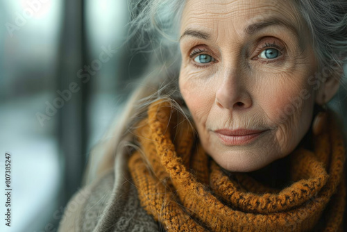 Old woman with grey hair and scarf next to a window in winter