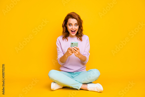 Omg new follower Full body photo crazy addicted woman sit legs crossed use smartphone read social network feedback comment impressed scream wear pink pullover isolated bright color background