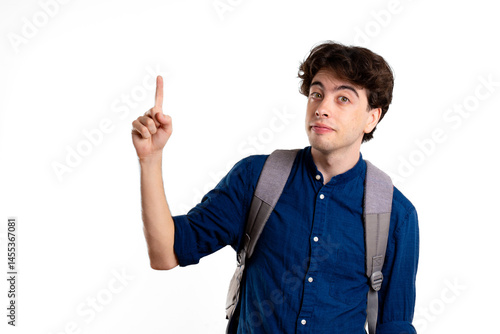 On white background for copy space, young Latin man carrying a backpack, pointing his finger