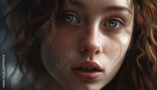 One beautiful woman, with curly hair, looking at camera, smiling generated by AI