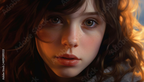 One cute child with brown hair looking at camera outdoors generated by AI