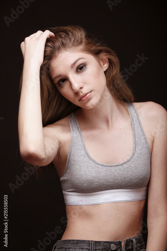 one person, teenage girl posing, looking to camera, upper body shot. wearing top and jeans. hand moving touching hair. looking to camera, studio shot, black background. front view.