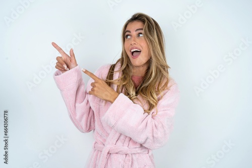 Optimistic Beautiful young woman wearing sleeping gown points with both hands and looking at empty space.